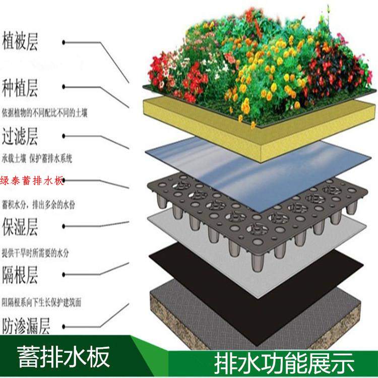 蓄排水板采用聚乙烯或聚丙烯經(jīng)加熱加壓定型形成的一種既能營造具有立體空間支撐剛度的排水通道,又可蓄水的一種輕型板材。該種板材自身就具有蓄水、排水兩種綜合功能,板材具有空間剛度極高的特點(diǎn),抗壓性明顯優(yōu)于同類產(chǎn)品(可以通過現(xiàn)場試驗(yàn)檢驗(yàn)),能夠承受400Kpa以上的高抗壓負(fù)荷,同時(shí)可以承受在種植頂板回填土過程中機(jī)械碾壓的極端負(fù)荷情況。